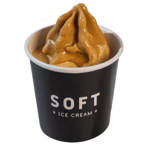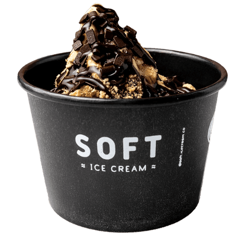 Sorvete de caramelo, calda de cookies spicy e farofa de cookies.