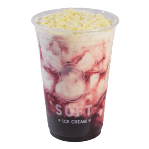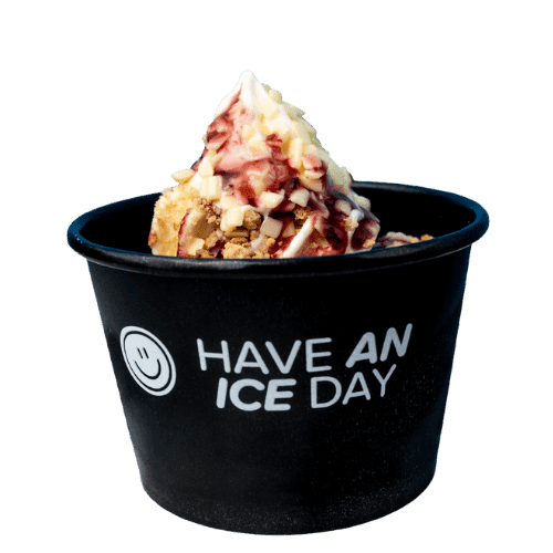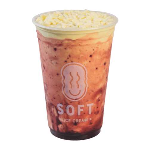 Sorvete de iogurte, calda de frutas vermelhas, farofa de cookies e confeitos de chocolate branco.