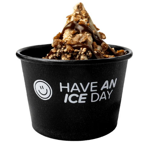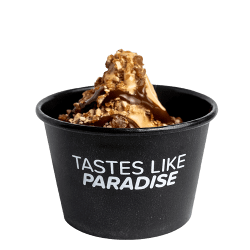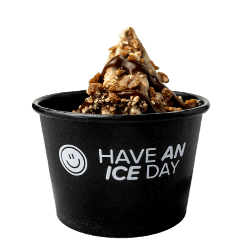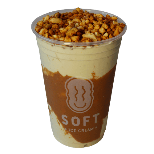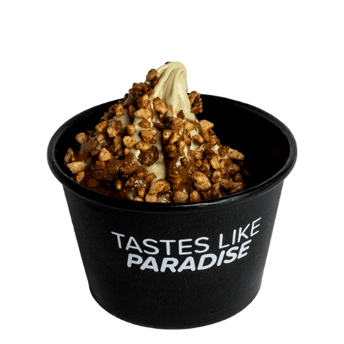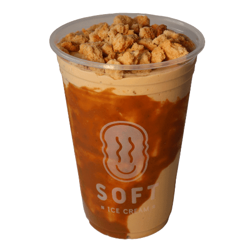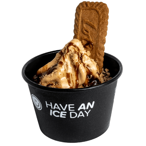 Sorvete de caramelo, calda de cookies spicy, farofa de cookies e Biscoff.