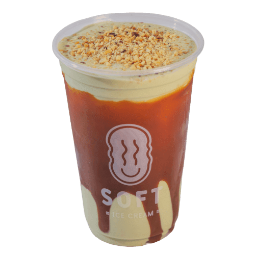 Sorvete de pistache, calda de caramelo toffee, crocantes e farofa de castanha de caju.