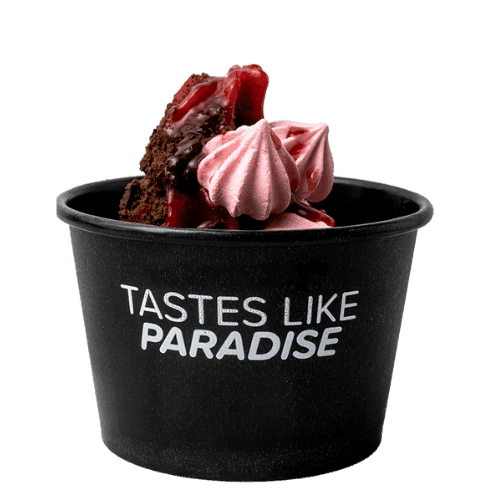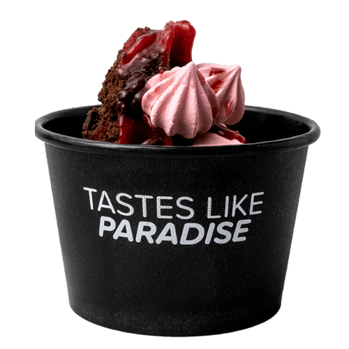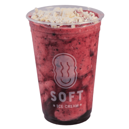Sorvete de frutas vermelhas, calda de frutas vermelhas, farofa de cookies de chocolate e suspiros.